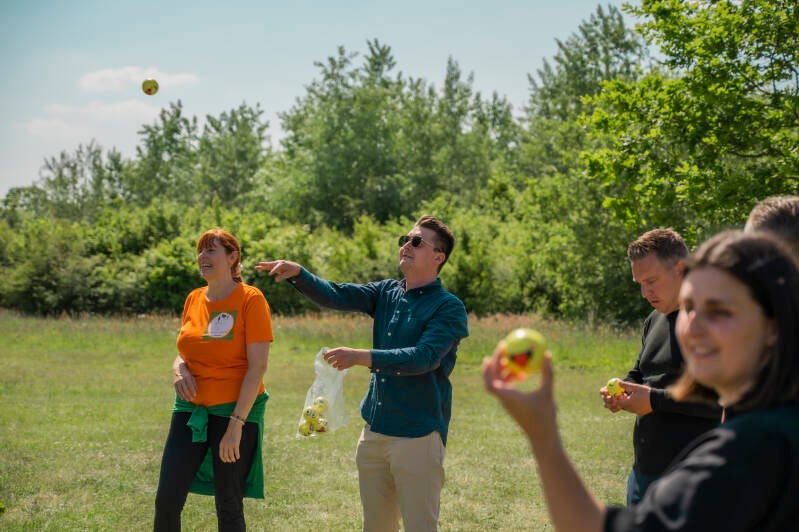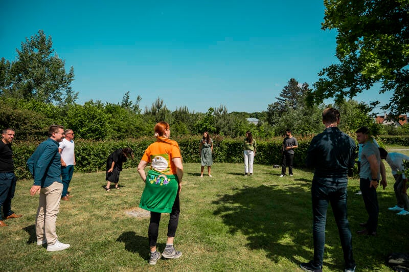 Vervolgens gaan we volledig los en lachen de longen uit ons lijf tijdens een buitengewoon leuke en verbindende lachworkshop met Katrien Meys.